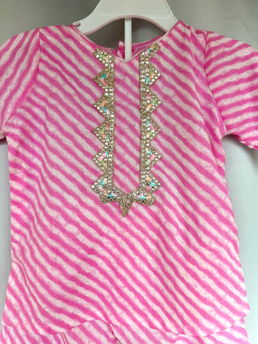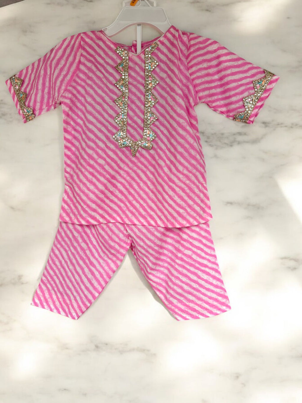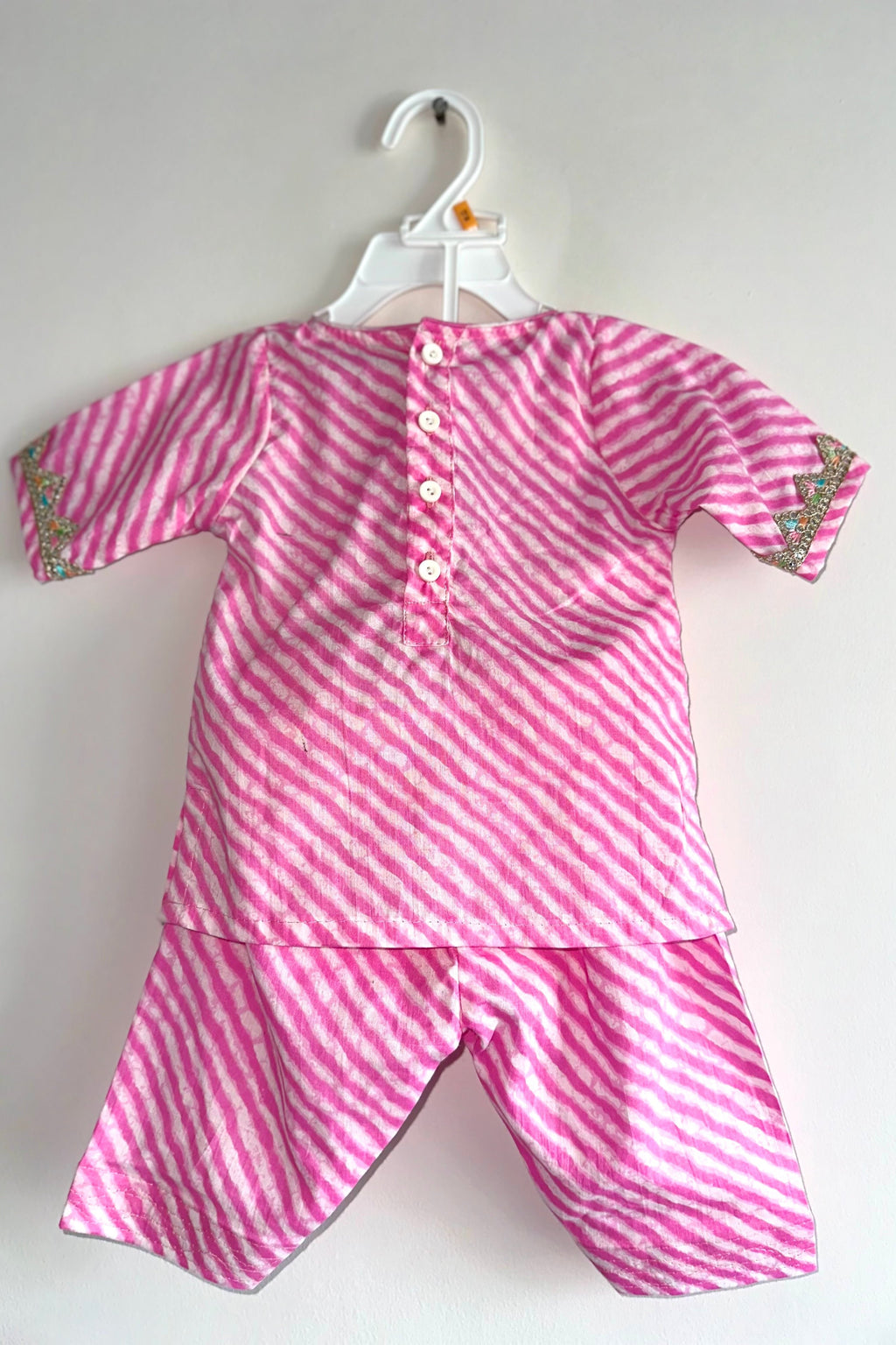 The Arya Kurta Set is made in high quality cotton fabric in leheriya print. The kurta features embroidered gota patti lace in the front and a button down open back paired with pair of salwar and dupatta with lace detailing.