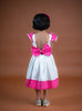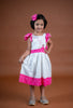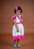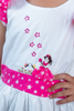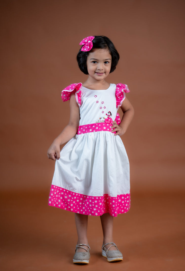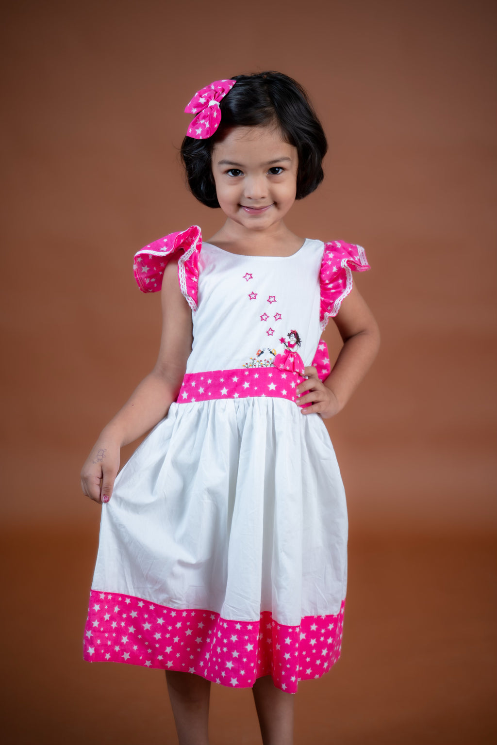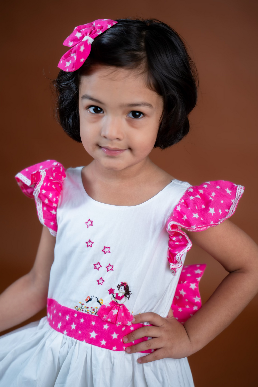The Wren Dress is made in high quality cotton fabric. It features a bodice with hand embroidered detail in the front, frilled flared sleeves and a knee length full flare with Pink polka dotted print belt, flare and bow detailing. It is fully lined with high quality 100% cotton for maximum comfort.